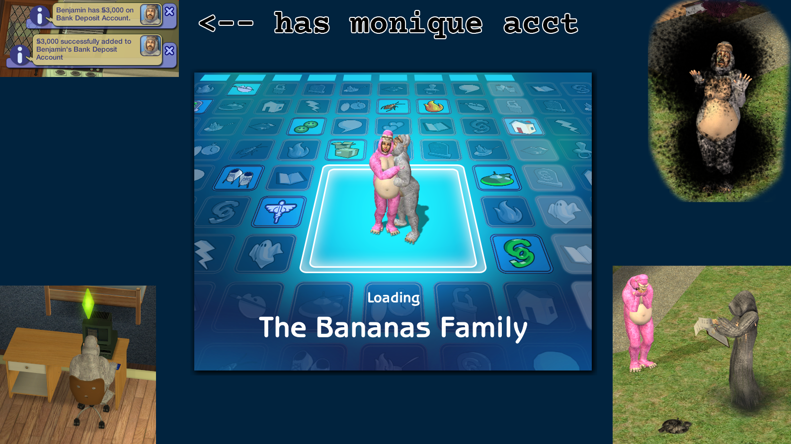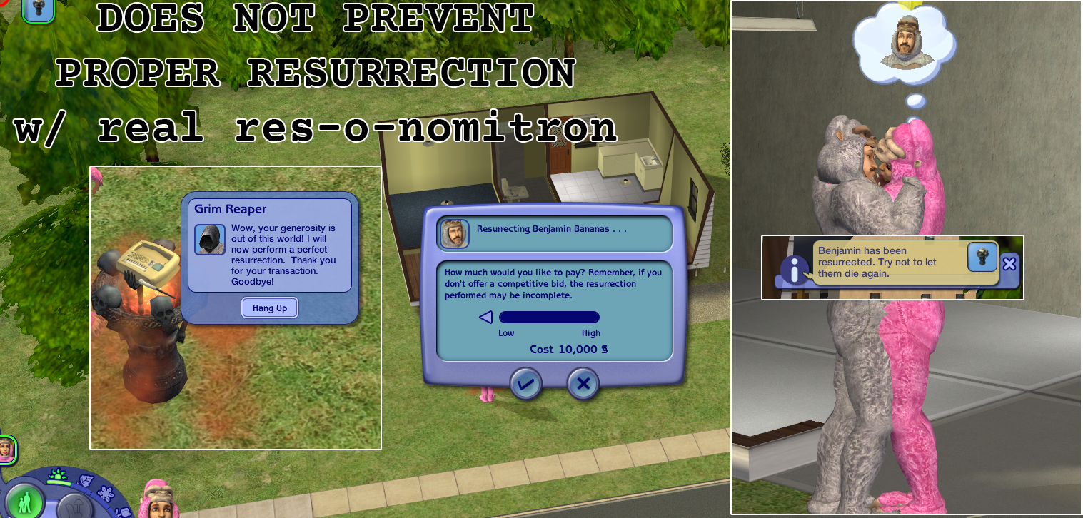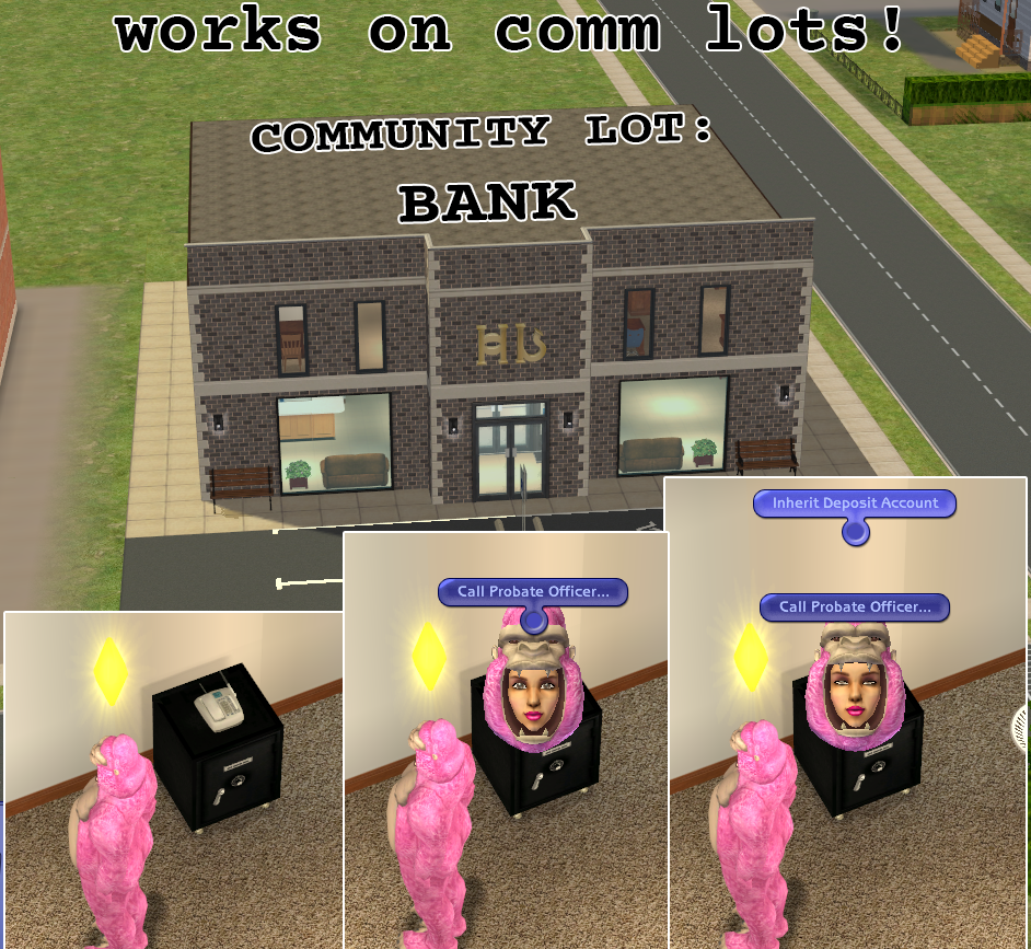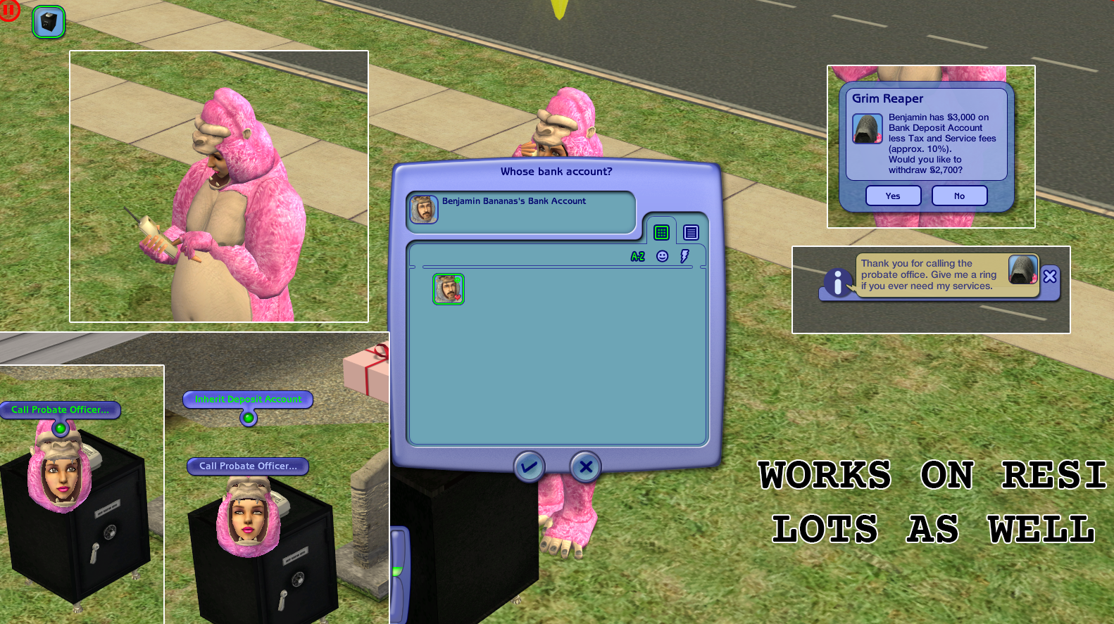 UPDATED: 01/21/2006: Uploaded MQ_Resurrect-O-Nomitron_Bank.zip, this is the updated version of Monique's Resurrect-O-Nomitron from here: http://www.modthesims2.com/showthread.php?t=80256 which I added a new feature "Call Grim Reaper.../Bank Account" that would allow your sims to call Grim Reaper and access or withdraw dead sim's bank deposit account.