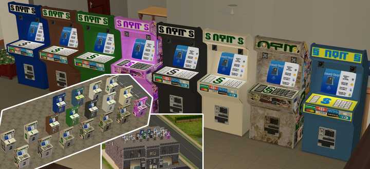 i've had plenty of happy rounds of Sims 2 with this arcade-looking atm in my lots. ofc they're great on community lots (including hotels)... but mainstays for dorms and apartments/flophouses, too! sometimes you just don't wanna give every single character a hacked computer, for whatever reason, while still giving them account access.