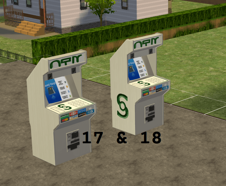 the first ATM object in the game might have been from RetailSims (pre-OFB business items). they had a recolor of the arcade machine. from monique's notes, i think she just used it as a visual base when she decided to make a different version of her hacked computer as an atm. (it requires the same banking/billing globals, it's just missing a bunch of pie menus that wouldn't make sense at an atm).