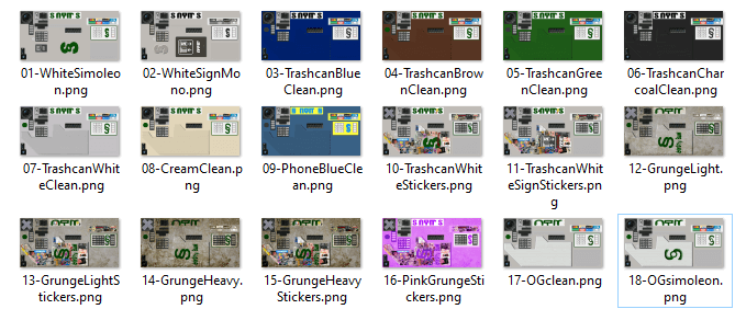 01 - (built in) New default texture. It's pretty much 'Trashcan White' (meaning it matches the outdoor trashcan's white recolor, a la Michelle's recolors), with a big green simoleon and a small ATM sign on the side.